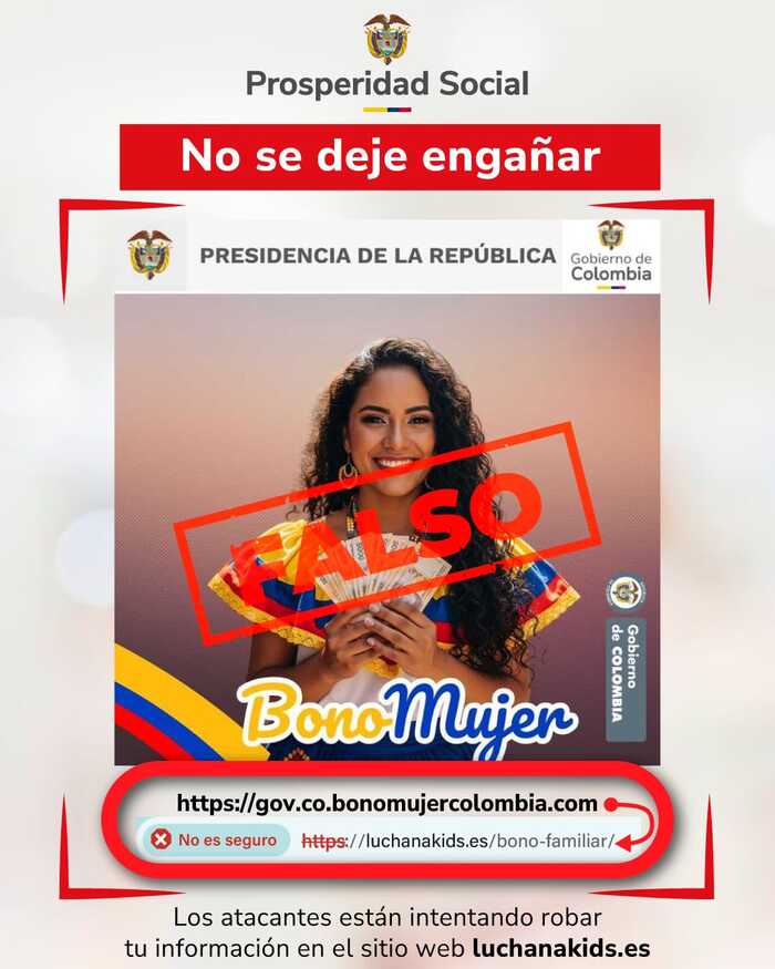 Prosperidad Social advierte a la ciudadanía que está circulando una publicación falsa en redes sociales y plataformas digitales, en la que se anuncia un supuesto “Bono Mujer de $850.000”, dirigido a mujeres mayores de 18 años a nivel nacional.