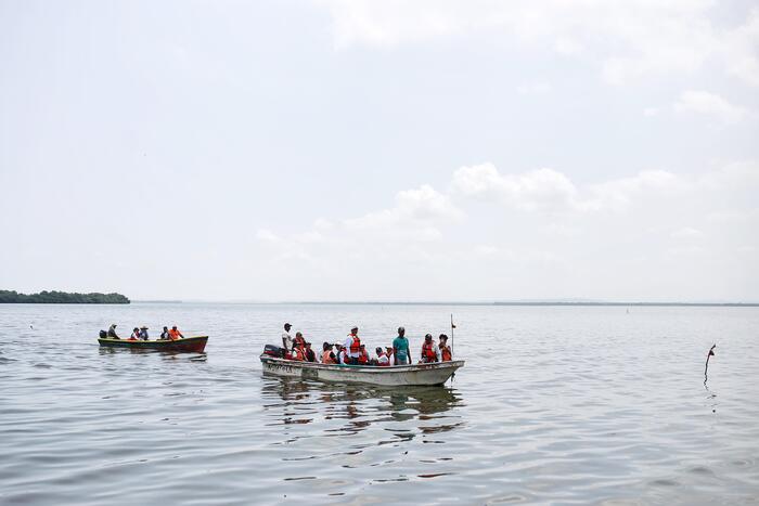 El ministro de Transporte, William Fernando Camargo Triana, y el alcalde de Cartagena, Dumek Turbay Paz, en un recorrido en chalupa por el caño Juan Angola, dialogaron sobre las oportunidades para un proceso de ordenamiento territorial de las comunidades aledañas, a partir de proyectos que impulsen el desarrollo urbano y una mejor calidad de vida.