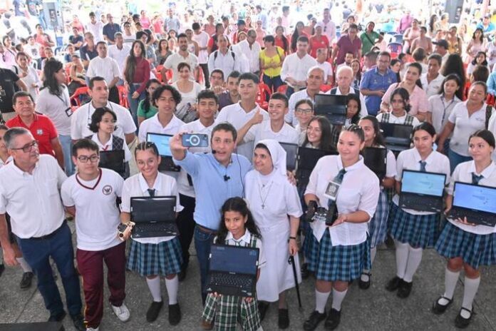 En su primer mes de trabajo, el ministro TIC, Mauricio Lizcano, entregó 2.160 computadores en cuatro departamentos, beneficiando a 34 instituciones educativas con miras a lograr la meta de que en Colombia haya un computador por niño.