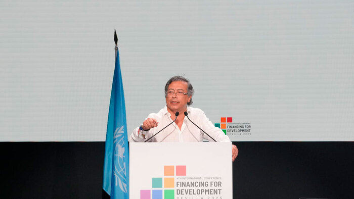 En su intervención ante la Cuarta Conferencia sobre Financiación al Desarrollo de la Organización de Naciones Unidas, ONU, en Sevilla (España), el presidente Gustavo Petro denunció que hay “una agenda postiza que desplazó la discusión principal, la cual tiene que ver con la vida de nuestros hijos colectivos y nos pusieron otra a discutir, llena de bombas, de genocidio, genocidio sobre Gaza, bombas sobre Irán, bombas sobre Israel, guerra en Ucrania, guerra en Rusia, guerra por el gas, guerra por el petróleo, guerra porque el poder del mundo pueda seguir dominando a la humanidad”.