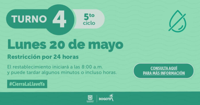 La quinta rotación de la restricción del servicio de agua en Bogotá para el turno cuatro comienza este lunes 20 de mayo a las 8 de la mañana; retornará el servicio el martes 21 de mayo a partir de las 8 de la mañana. Tenga en cuenta que en algunas zonas la normalización del servicio podrá tomar un tiempo adicional.