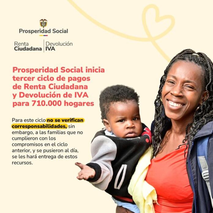 Prosperidad Social anuncia el inicio del tercer ciclo de pagos de los programas Renta Ciudadana y Devolución del IVA, entre el 6 y el 21 de agosto, para 710.000 beneficiarios bancarizados y no bancarizados. La inversión total para esta entrega es de 324.897 millones de pesos